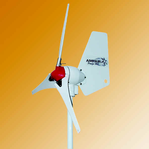 A03-1012 A03-1024 A03-1048 300W Wind Generator Ampair (Pacific) 300 wind turbine system The Ampair (Pacific) 300 wind turbine system is suitable for larger yachts, small industrial locations, or remote holiday cabins. This microwind turbine has evolved from the outstandingly rugged Ampair 100 unit with the addition of the revolutionary PowerFurlTM blade pitch control system, advanced aerodynamic blade design and a more powerful generator. Ampair 300 Features: * combines non-intrusive operation with elegant modern styling, Technical Specifications Power output Click the chart below for output curve. DC cable length and voltage drop