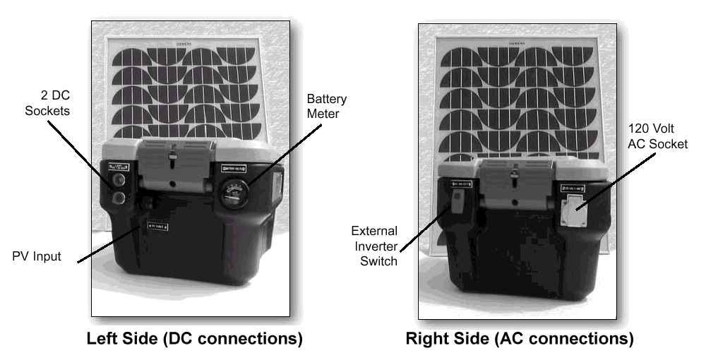 The PPG is designed to be recharged from a solar module. However it can also be recharged using any 12V battery charger and an AC power source. When recharging from the sun a built-in controller monitors the charge to avoid under and over charging the battery and a meter displays how much charge is in the battery. The internal inverter converts dc to provide the 120Vac output for use with common household appliances. An externally mounted rocker switch lets you turn off and on the inverter to avoid the idle current from draining the battery. Includes (1) 120Vac outlet with an outdoor cover as well as (2) 7.5A 12Vdc sockets mounted in the end plate. The battery is a deep-cycle type rated for many charge/discharge cycles. One 40W solar module is included with provisions for adding up to two more for quicker recharging.