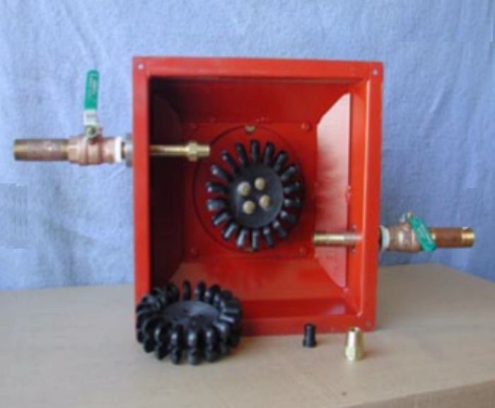 The water box mounts over a 14” X 14” square hole. Water discharge is out the bottom. The water box is available in one thru four nozzle versions with or without valves and several different manifold or pipe options. Standard jet sizes are from .125” to .760” with best efficiencies falling between .250” and .620”.