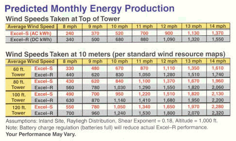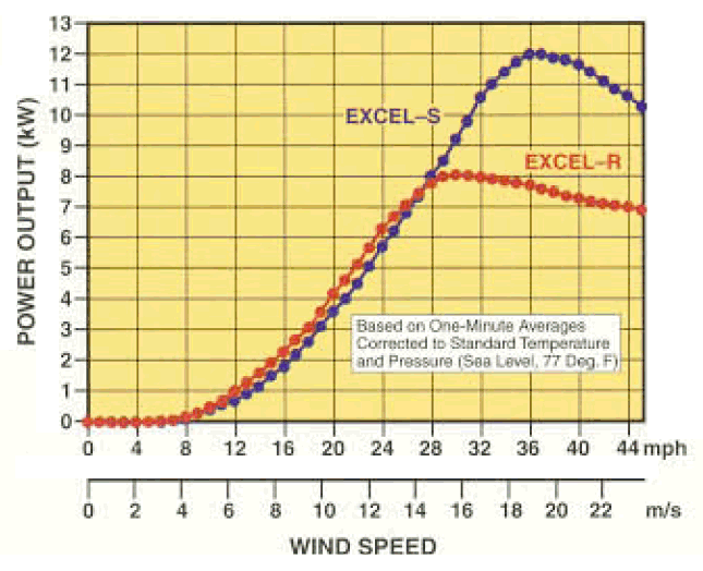 The performance data shown in the two thumbnail images above have been compiled in accordance with industry standards as established by the American Wind Energy Association. The power curve is corrected to standard temperature and pressure. The estimated monthly energy output (kilowatt-hours) assumes the AWEA standard distribution of wind speeds.