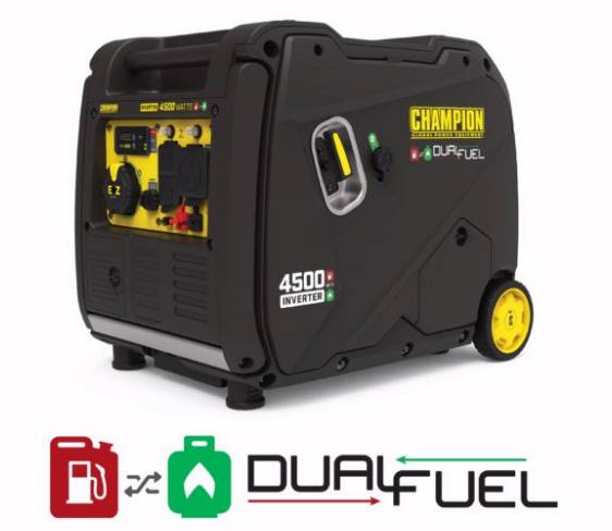Operate your Dual-Fuel generator right out of the box on gasoline or propane, and easily switch fuels with the EZ Start dial. When the 2.3-gallon tank of gasoline is full, the 212cc Champion engine produces 4500 starting watts and 3500 running watts and will run for up to 14 hours at 25% load. When using a 20-pound propane tank, it produces 4500 starting watts and 3150 running watts and will run for up to 21 hours at 25% load.