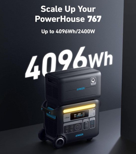 Double the Power: Use 760 Expansion Battery (2048Wh) with Anker PowerHouse 767 (2048Wh) and scale up the battery capacity to 4096Wh.