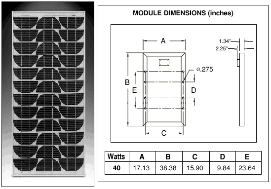 Solar Modules Peak Power Output 40 watts at 16.7V 2.40 amps Maximums 21.0 V open circuit
