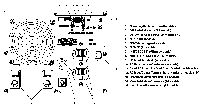 | DIP Switches | battery type high voltage transfer at 135, 145 VAC low voltage transfer at 75, 85, 95, 105 VAC |