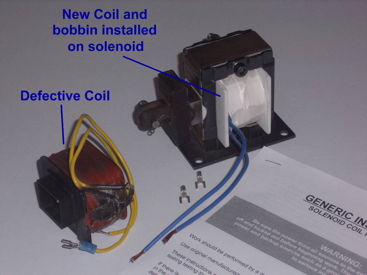 | Typical good and bad coils | Replacement coil installed on solenoid | Some have rectifiers and varistors under tape | Replacement coil with new bobbin |