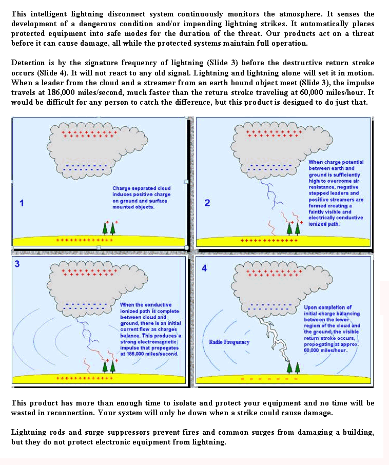 Introducing a new controller for protecting valuable equipment from lightning damage. Rather than attempting to absorb the lightning surge after it has arrived at your critical equipment, this controller anticipates the lightning surge and disconnects your equipment before it arrives! This technology, which has been available to industry, government and the military, is now available to small businesses and homeowners. Perfect for protecting any vital and high-value equipment such as: