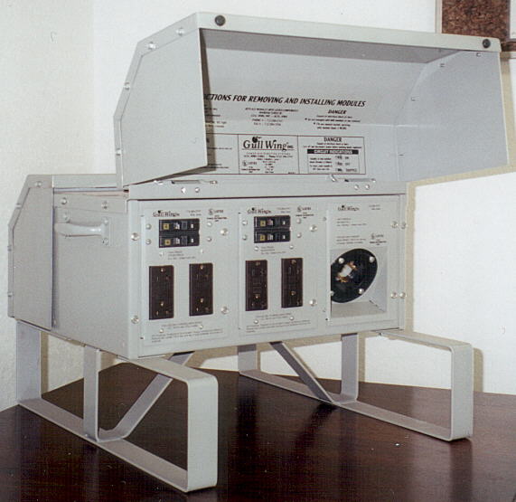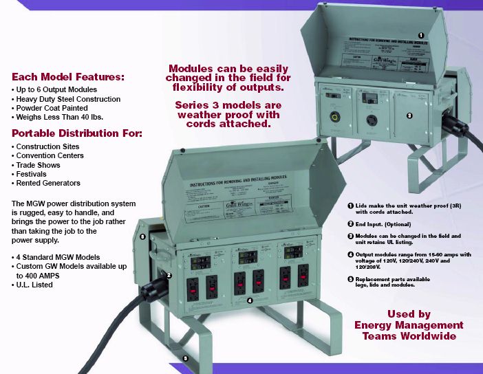 50 amp Outdoor, 3 Output ModulesBring the power to the job rather than taking the job site to the power pole or generator. Portable power distribution unit or "Spider Box" with one input and up to five output modules. Rugged heavy duty steel construction but easy to handle. Weighs only 20 to 40 pounds. Dimensions 20"L x 21"D x 14"H. Powder coat painted. Modules can be changed in the field. Three modules are located on the front and three on the back. These are manufactured by Gull Wing Industries which supplies nearly all the portable distribution units for the carnival industry nationwide. All units are preassembled and tested at the factory and are UL and cUL Listed. Made in USA