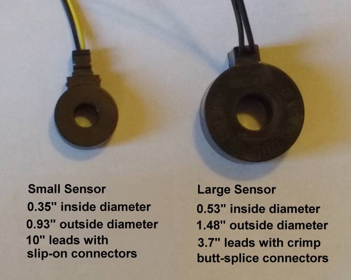 We now offer two donut sensor sizes. The smaller size with a 0.35" I.D. window fits inside the box with the meter and accommodates a single conductor. The larger sensor has a 0.53" I.D. window and is suitable for summing the current in TWO conductors. Due to its size it must be mounted remotely--typically in the nearby switch or load center enclosure. This sensor is useful if you want to sum the currents in the two hot legs of a generator to display total TOTAL load on one meter rather than displaying the separate load on each hot leg on two meters. Keep in mind that when summing the currents on a 120/240V single phase system the two wires must be passed through the sensor in opposite directions.