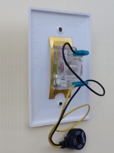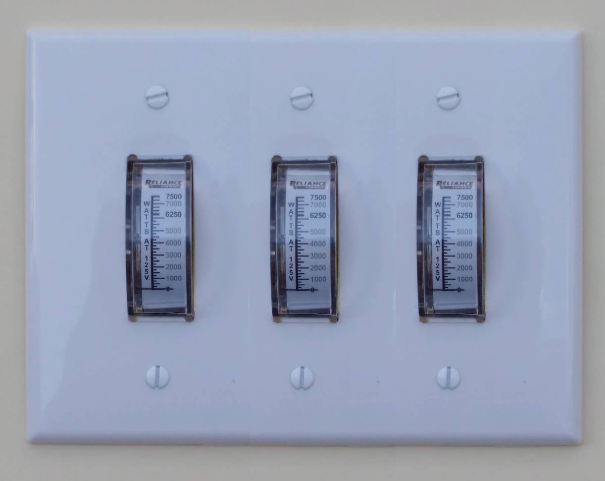 Kit includes pre-punched off-white nylon plate for mounting in any standard wall switch box. Installer must provide plastic or metal 1, 2 or 3 gang switch box (for 1, 2 or 3 meter kit). Meters sense the power using the included donut current transformer sensors (CTs). Sensors are normally mounted behind meter in electrical box, but wires can be extended for remote transformer mounting. Meter scales read in Watts at 120VAC for each hot leg of power system. Made in USA