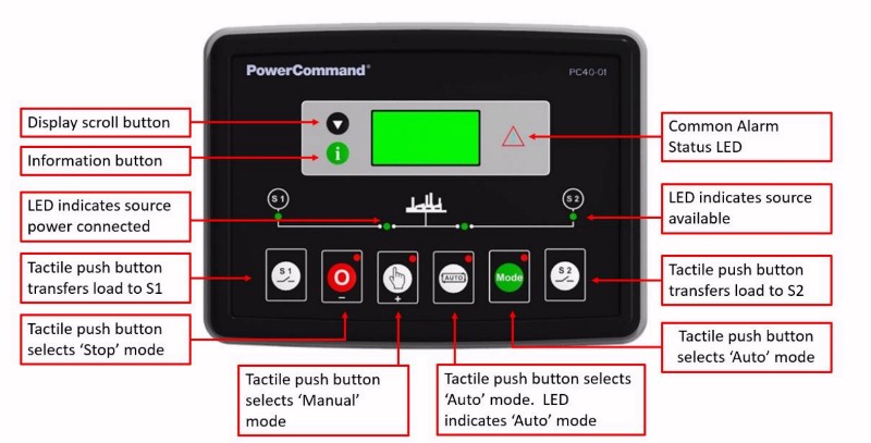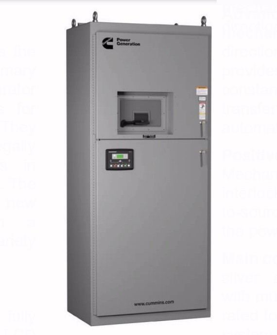 PowerCommand® 40-11 control – A fully featured microprocessor-based control with LCD digital display and tactile-feel soft-switches for easy operation and screen navigation. Control highlights include front panel PC software configuration, three phase sensing on both sources, sync check, phase rotation and imbalance sensing, and event logging. Additional optional features include load shed from standby source, Modbus RTU and TCP network communication, and configurable output contact modules. Completely network compatible with the new Cummins transfer switch remote annunciator. Please see the S-6560 PowerCommand® 40-11 control specification sheet for the full description, benefits, and features.