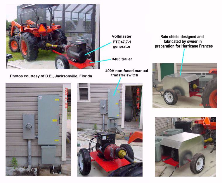 My tractor will need to remain outside when the generator is running and there is a 98% chance it will be raining so I will need to figure out a cover for the generator. Over all it is a great solution, thanks for your help. --D.E., Jacksonville Florida, August 2004