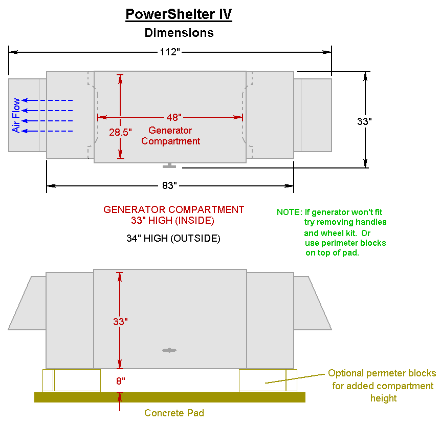 The new PowerShelter IV is designed to house your portable generator outdoors for both storage and operation. This product has some unique features that are not offered by anyone else. Overall dimensions are 112" L x 33" D x 34" H providing ample room for most LARGE portable generator sizes up to 18kW. Extra high capacity dual cooling fans positioned on both the intake and outlet provide the enhanced cooling and circulation required by these large generators. And the hoods come standard to reduce the possibility of rain entering the generator compartment due to the higher air velocity.