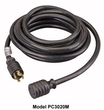 30 amp, 125/250 Volts, super capacity 10 Gauge 4 conductor wire, 20 or 25 feet, type SJTW water resistant 60C FT2 300V insulation. For connecting portable generator to transfer switches, panels or inlet boxes. NEMA twist lock L1430 plug and connector molded on each end of cable. UL/cUL listed and CSA certified. Exclusive 24 month warranty.