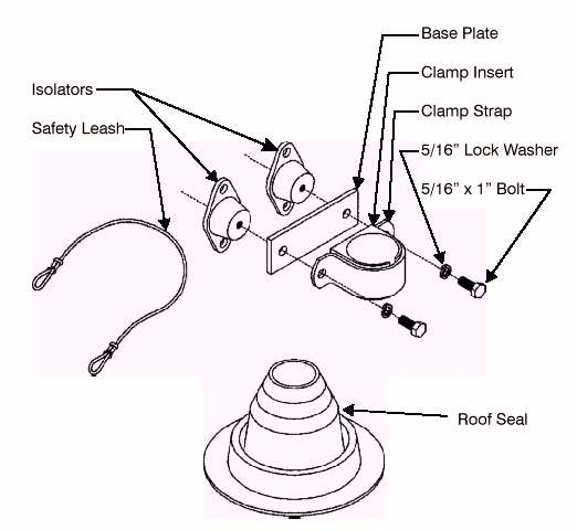 Roof mounting kit for AIR wind generators. Designed to be bolted to building framing using lag screws (not included). Vibration isolators included reduce noise transmission to building. Kit includes hardware, isolators, clamps, sleeves, safety leashes roof seal and instructions. Pipe and lag screws not included.