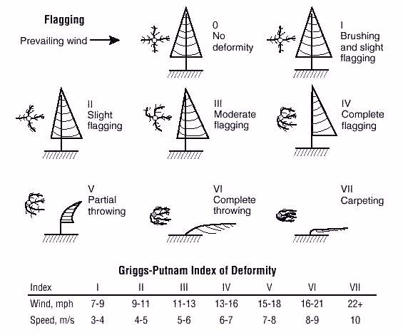 The Griggs-Putnam Index is one of several methods of estimating the prevailing wind speed at a site by observing the growth patterns of trees. Strong winds will deform trees and shrubs so that they indicate an integrated record of the local wind speeds during their lives. The effect shows up best on coniferous evergreens because their appearance to the wind remains relatively constant during the year. Deciduous trees shed their leaves in the winter and thus change the exposed area tremendously. If average wind speed is high but still below some critical value, above which deciduous trees cannot survive, they will not indicate relative differences in wind speeds very well, although they do show distinctive wind damage.