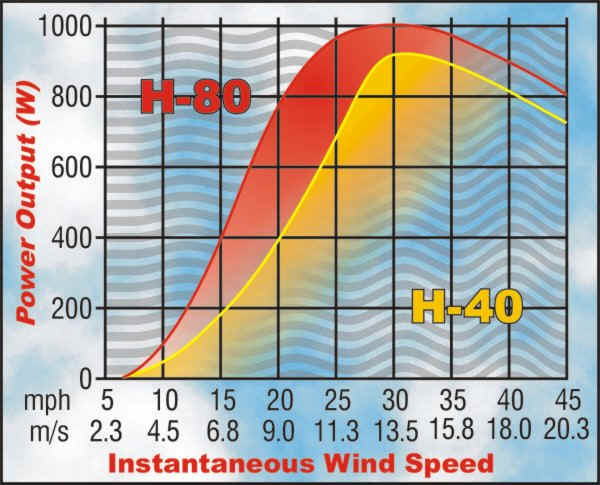 The actual output of a wind generator depends on wind speed. The chart below shows manufacturers specifications for watt output of two of the machines we sell at different wind speeds. It is important to get a machine that will deliver the power required at the wind speed available In your area.