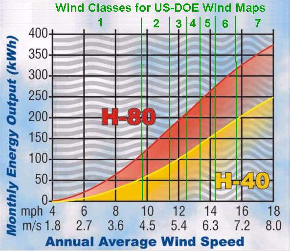 But instantaneous watt output at each wind speed does not tell the whole story about a wind turbine. A more meaningful picture is gained by looking at the total ENERGY output over a period of time. Electrical energy is usually measured in kilowatt hours (KWH) and this is the unit used on your electric bill. If you know the average wind velocity for your site either by measurement or from wind maps you can estimate the KWH output per month using the manufacturer's chart for the turbine of interest. The following shows the KWH per month for the same two turbines mentioned above.