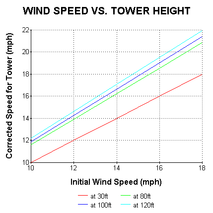 If you measure wind speed at ground level, you can expect about 1.5 times the wind speed 30 feet up, which equates to about three times the power. At 120 feet above the ground, wind speed will be twice what is measured at ground level and power output will be more than twice the output at 30 feet.